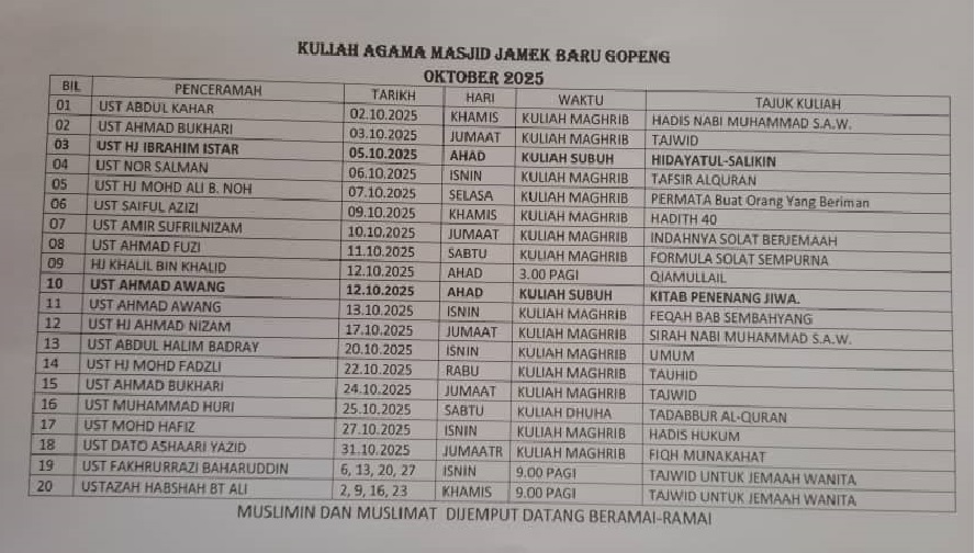 Jadual Kuliah Maghrib Oktober 2025